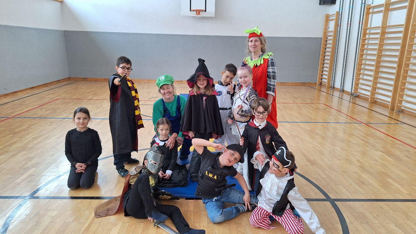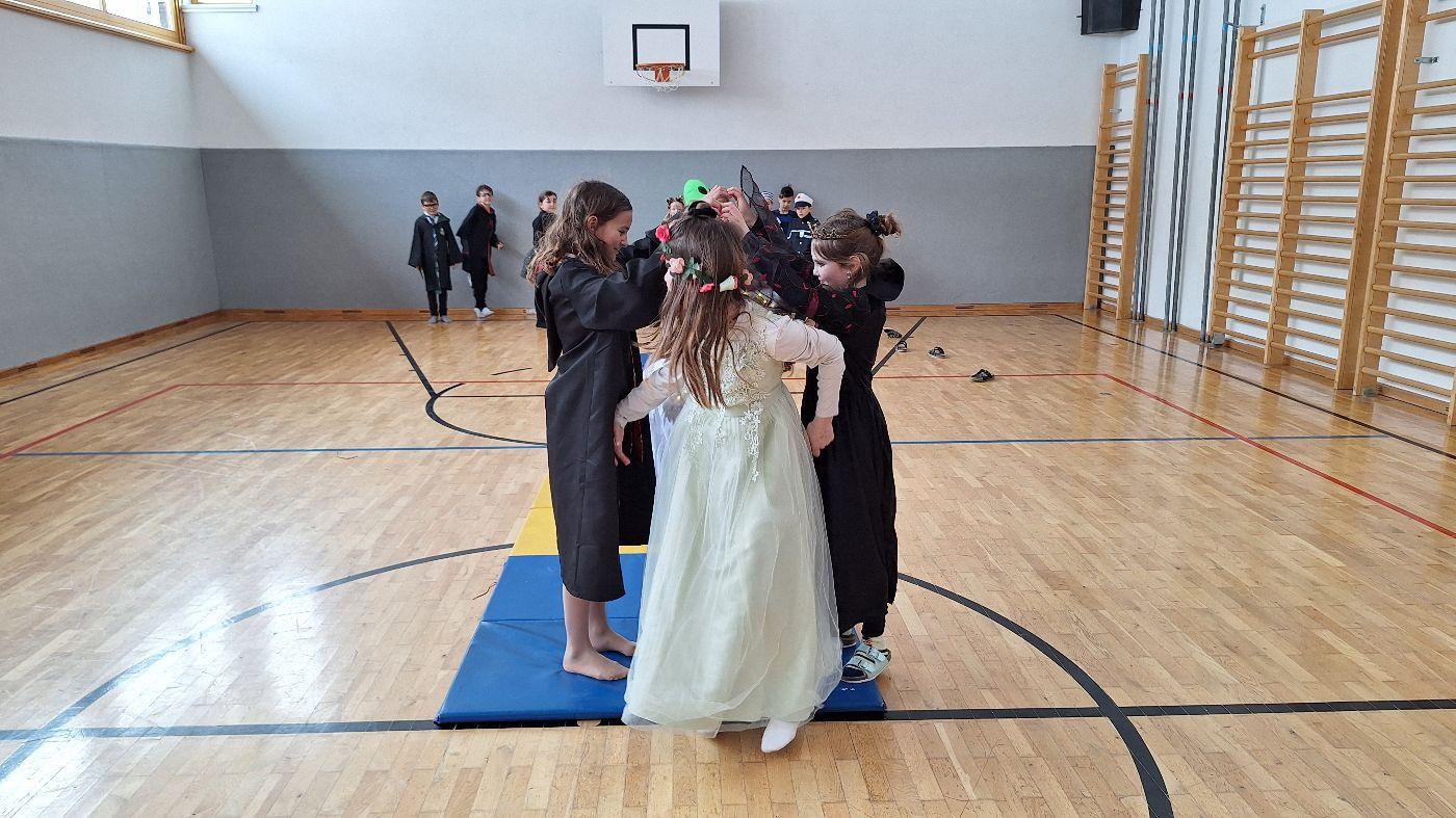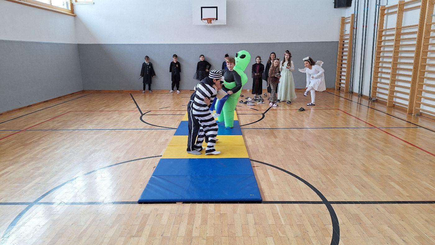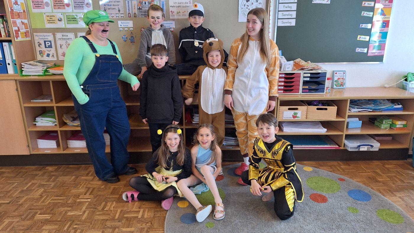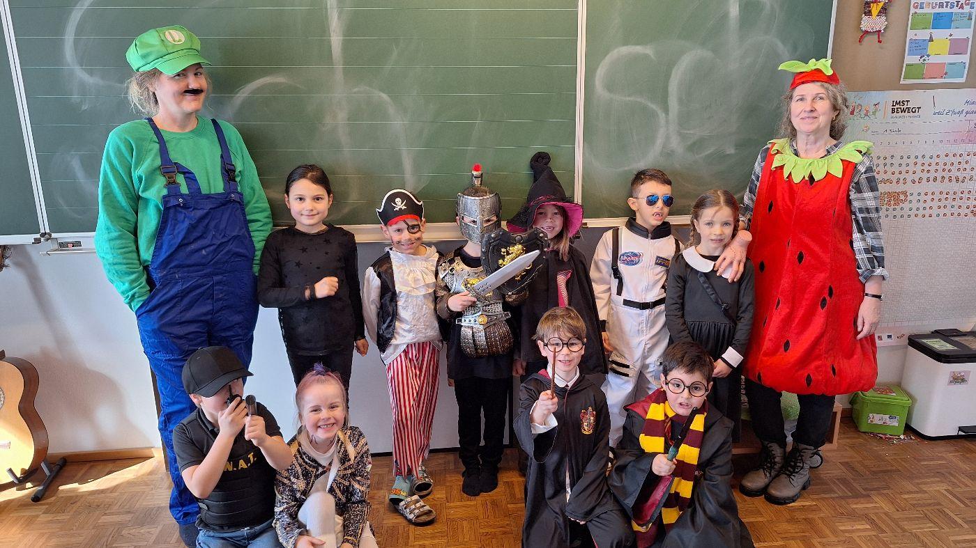 Am Faschingsdienstag kamen alle verkleidet in die Schule. Nach der Pause starteten wir mit unserer Faschingsfeier. Es gab Krapfen, die uns die Gemeinde spendierte (Danke!) und wir veranstalteten eine "Modenschau", bei der alle ihre Kostüme präsentieren konnten.