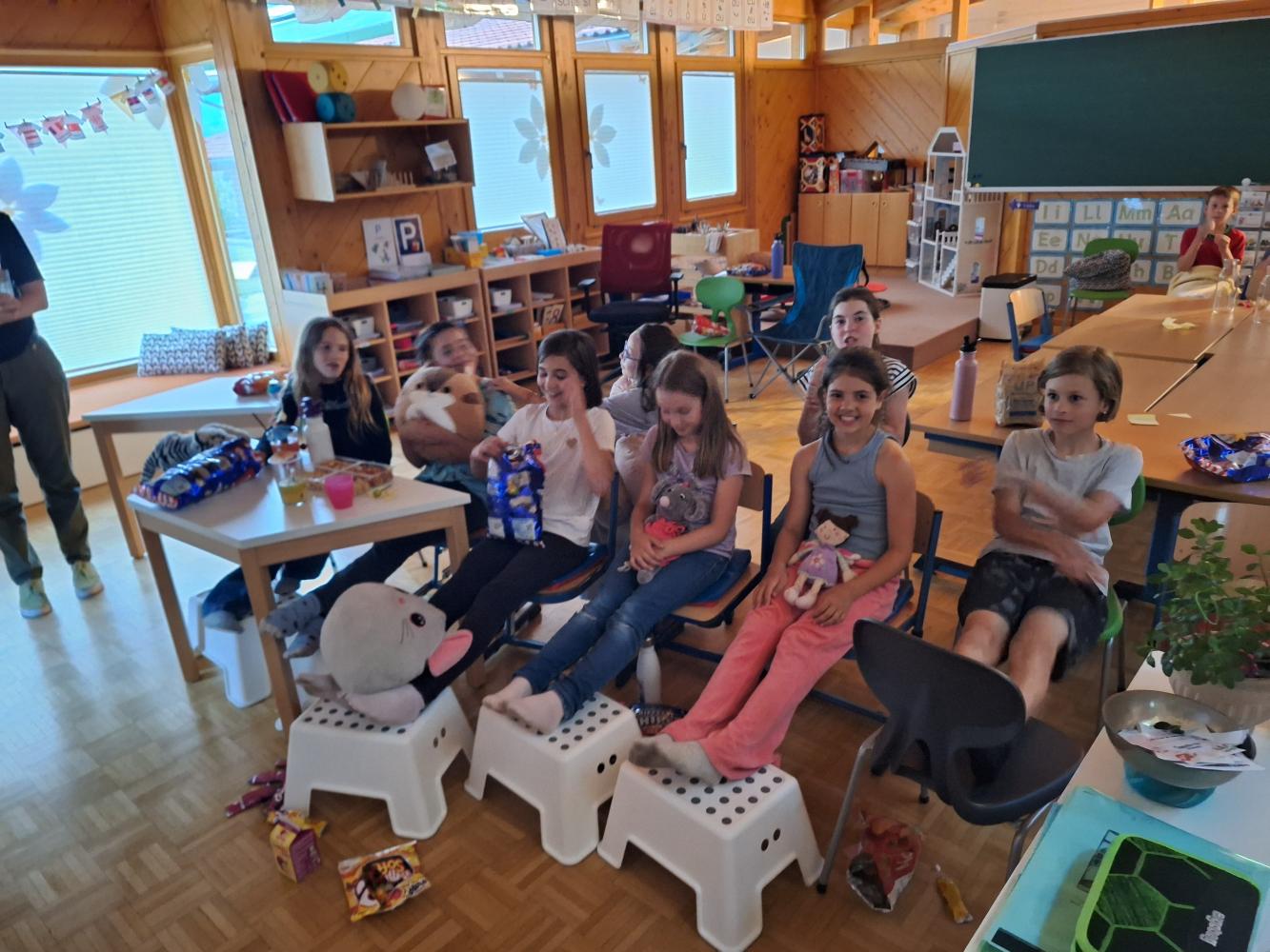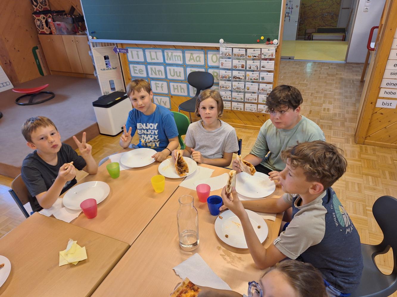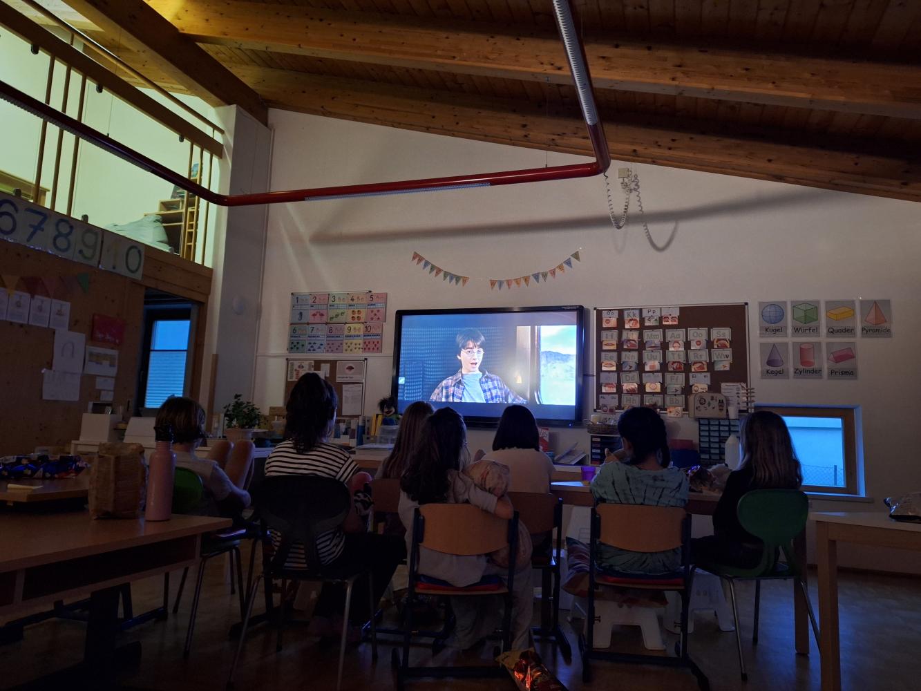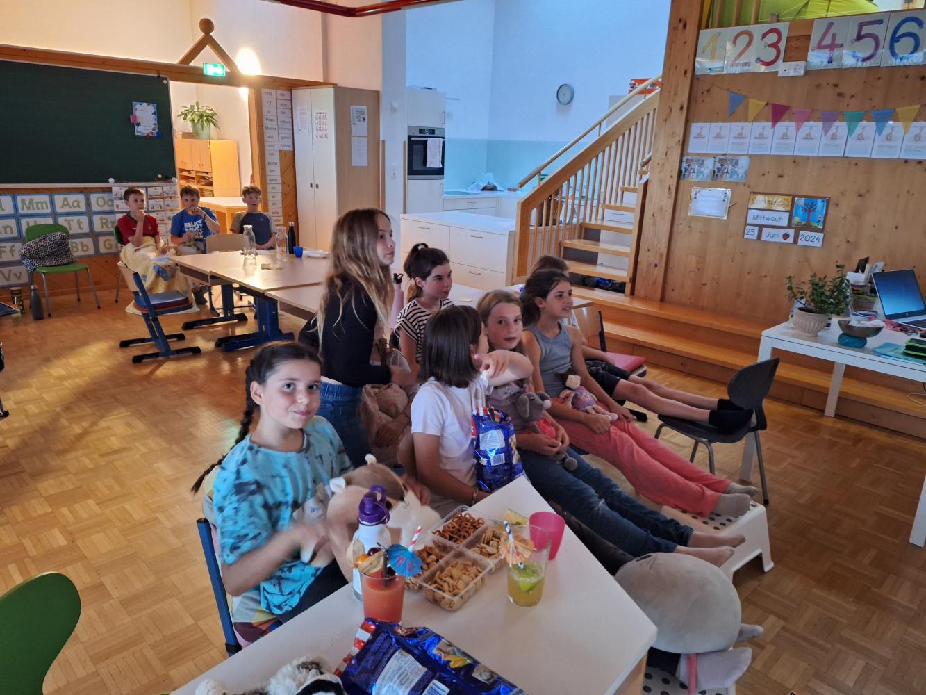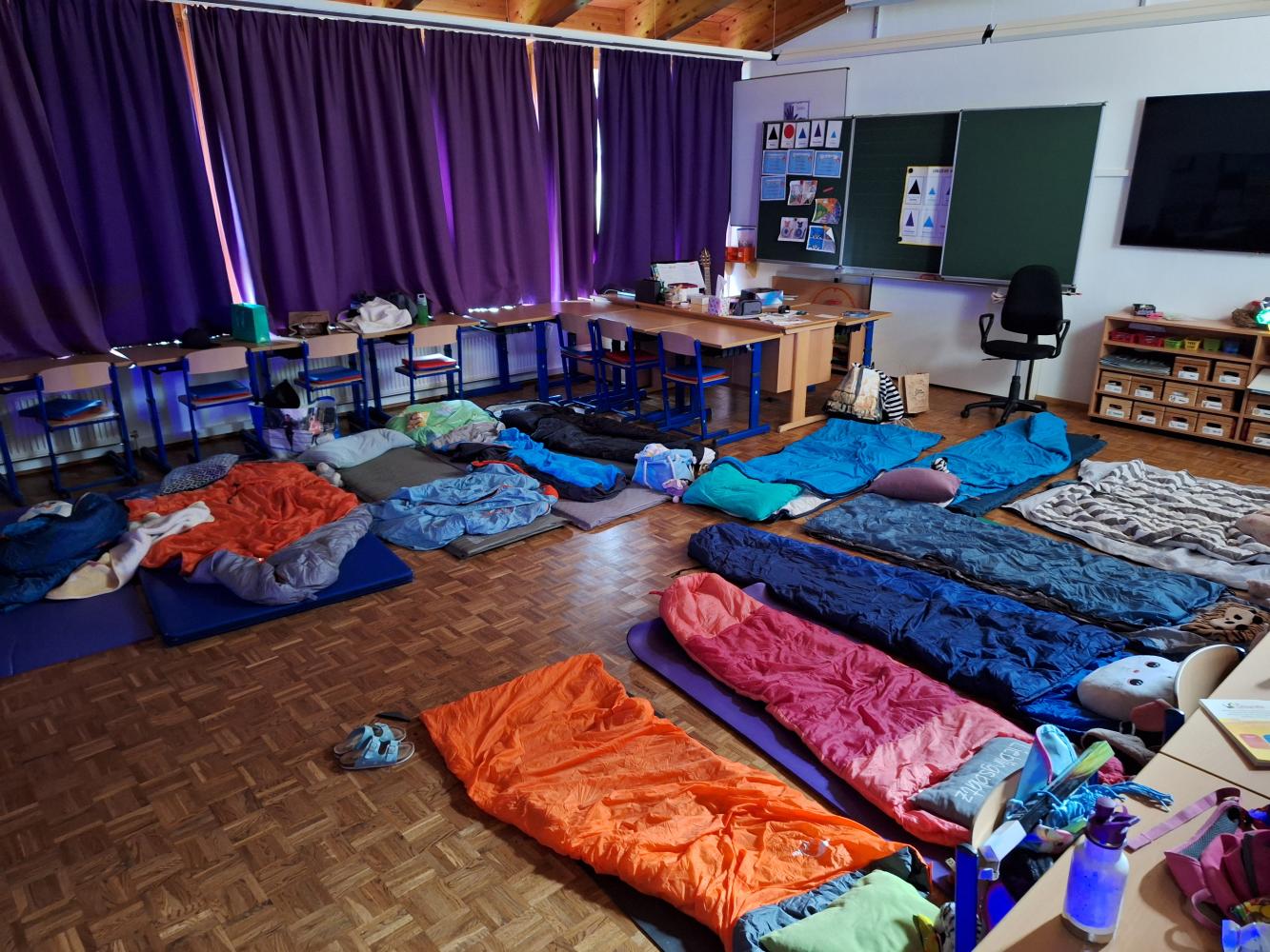 Die 4. Klasse übernachtete zum Abschluss in der Schule. Im Klassenzimmer wurde mit Matten und Schlafsäcken das Nachtlager aufgebaut. Zuerst gestellten wir uns Pizza und im Anschluss begannen wir mit dem Filmschauen. Zur Überraschung der Kinder bereiteten einige Eltern Kinder-Cocktails vor, die die Kinder bei einer kleinen Kinder-Party genossen. Später wurde der Film weiter geschaut und vor dem Schlafengehen erzählten wir uns noch Gruselgeschichten. Am nächsten Tag bereiteten die Kinder ein leckeres Frühstück vor, zu dem auch einige Eltern kamen.