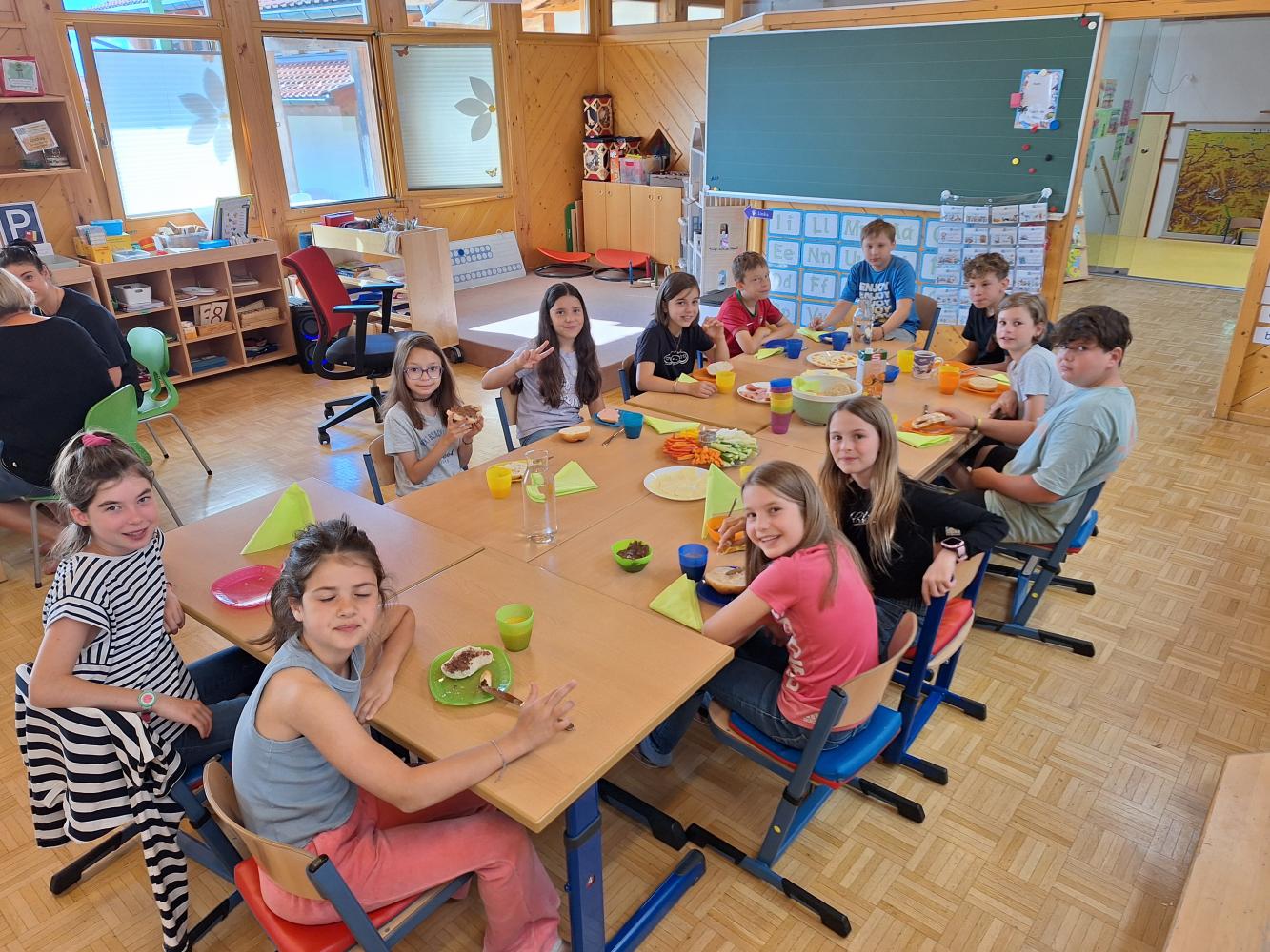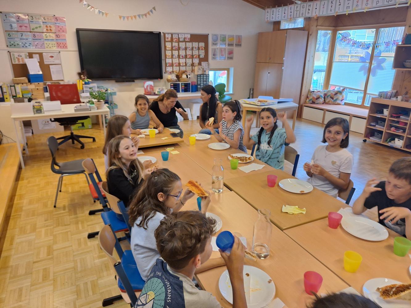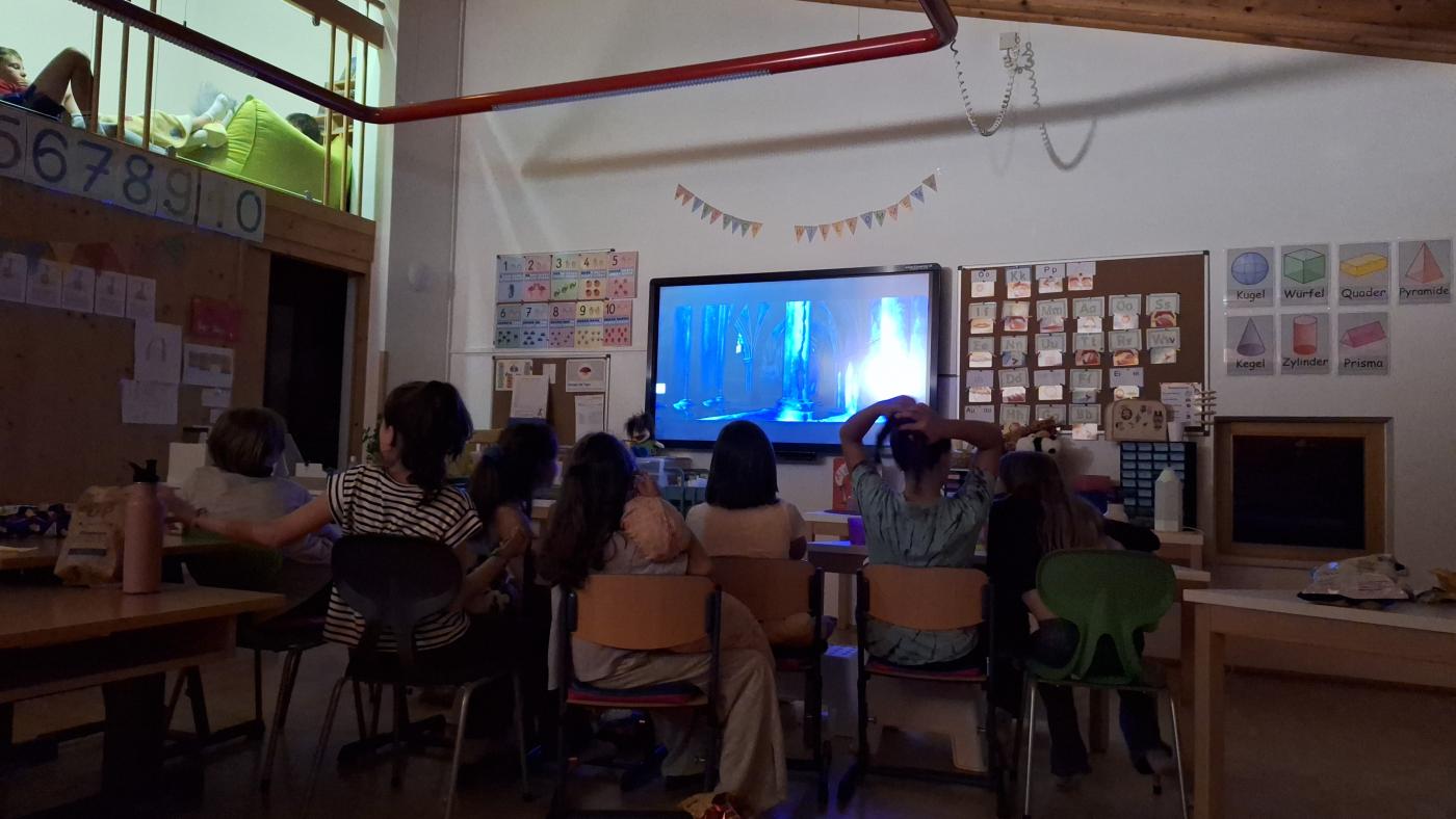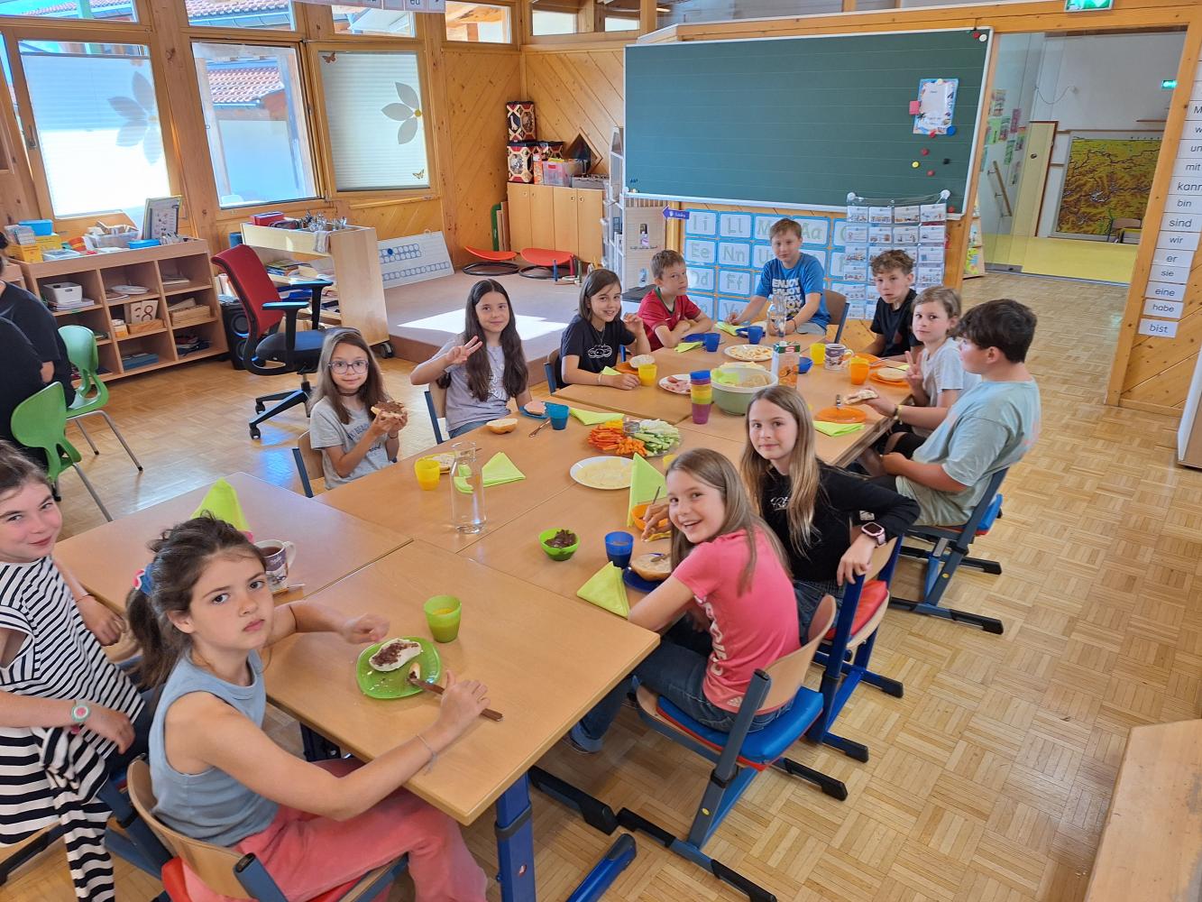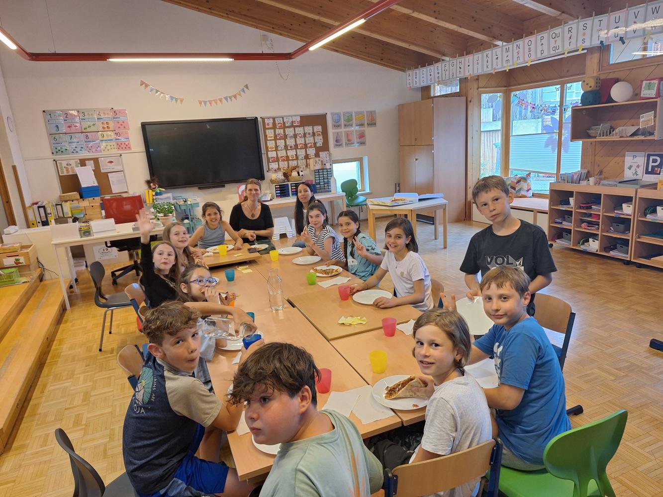 Die 4. Klasse übernachtete zum Abschluss in der Schule. Im Klassenzimmer wurde mit Matten und Schlafsäcken das Nachtlager aufgebaut. Zuerst gestellten wir uns Pizza und im Anschluss begannen wir mit dem Filmschauen. Zur Überraschung der Kinder bereiteten einige Eltern Kinder-Cocktails vor, die die Kinder bei einer kleinen Kinder-Party genossen. Später wurde der Film weiter geschaut und vor dem Schlafengehen erzählten wir uns noch Gruselgeschichten. Am nächsten Tag bereiteten die Kinder ein leckeres Frühstück vor, zu dem auch einige Eltern kamen.