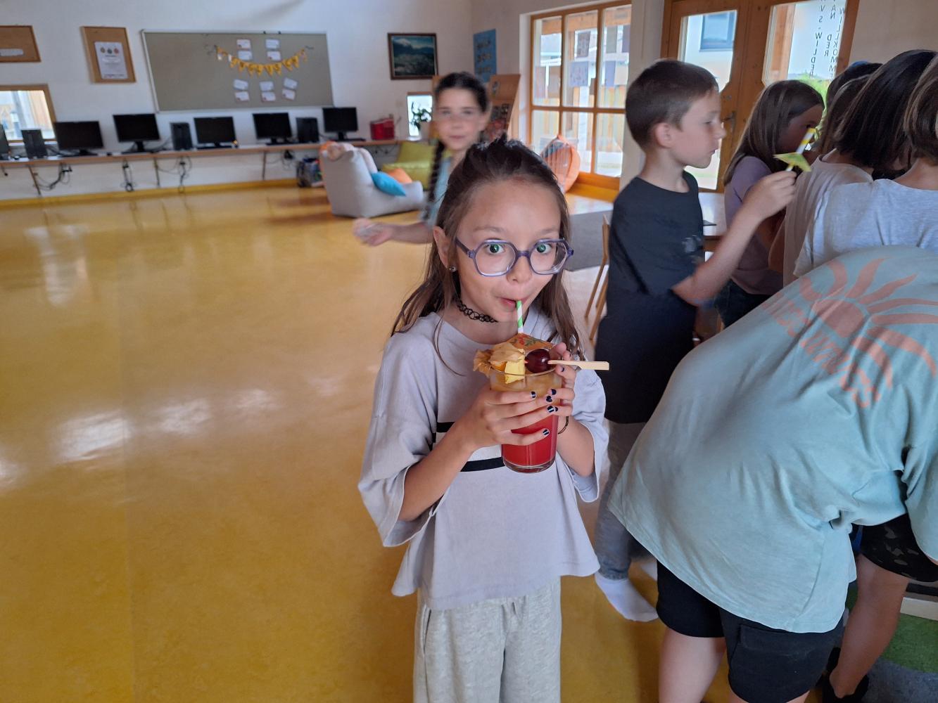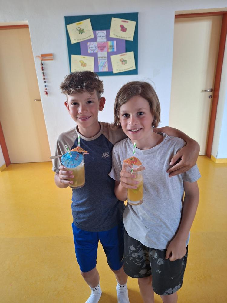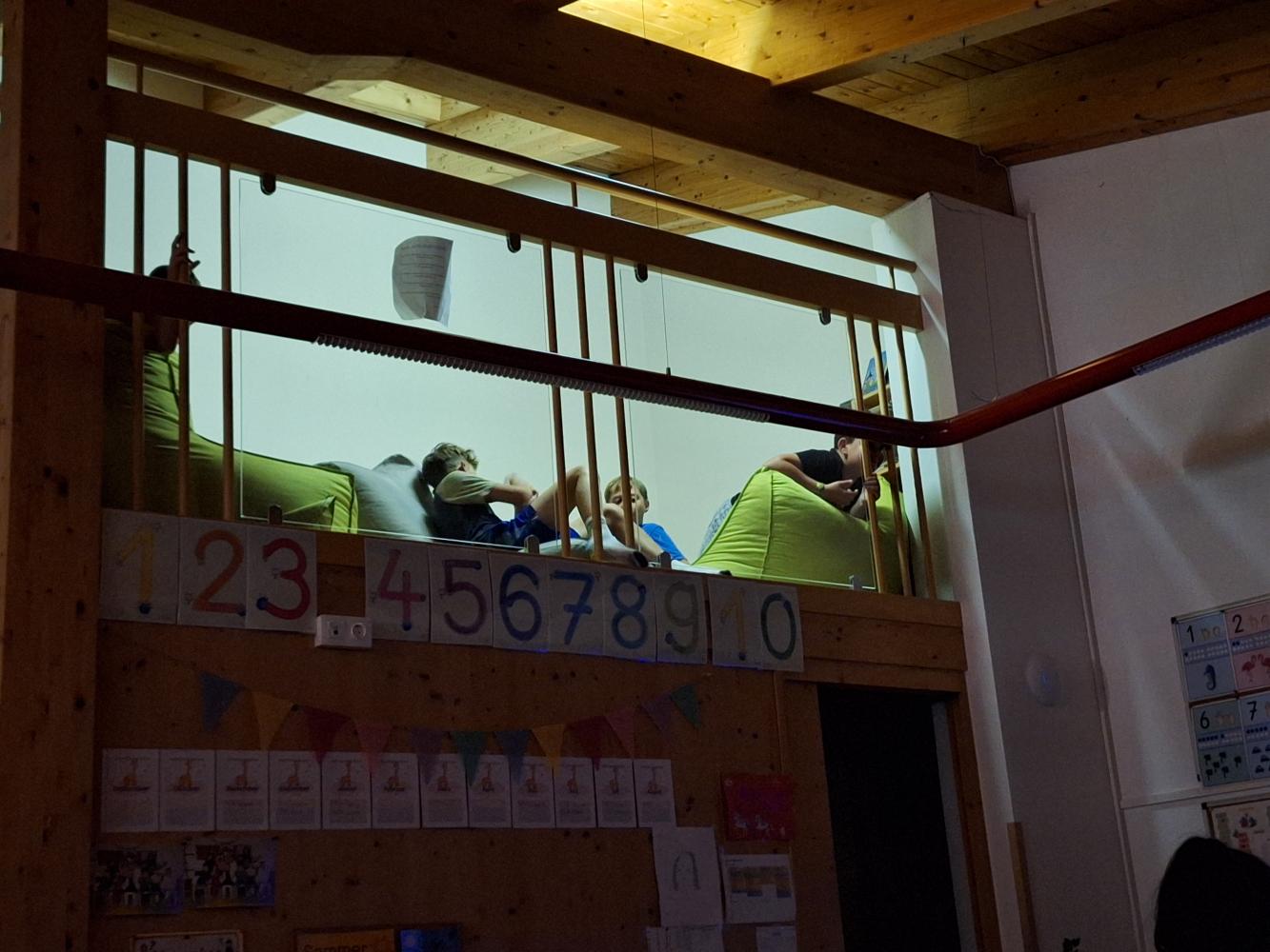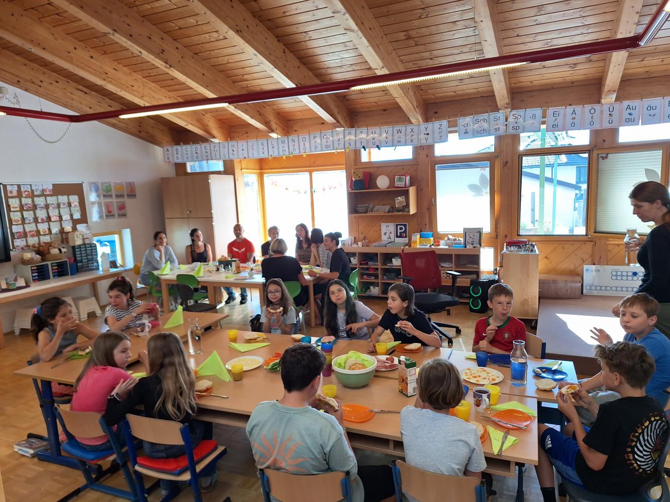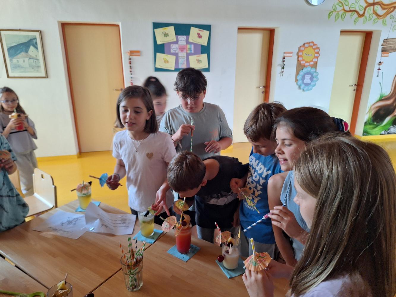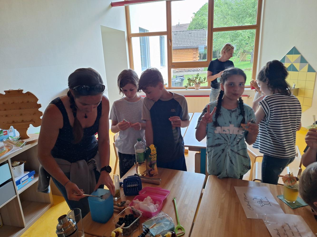 Die 4. Klasse übernachtete zum Abschluss in der Schule. Im Klassenzimmer wurde mit Matten und Schlafsäcken das Nachtlager aufgebaut. Zuerst gestellten wir uns Pizza und im Anschluss begannen wir mit dem Filmschauen. Zur Überraschung der Kinder bereiteten einige Eltern Kinder-Cocktails vor, die die Kinder bei einer kleinen Kinder-Party genossen. Später wurde der Film weiter geschaut und vor dem Schlafengehen erzählten wir uns noch Gruselgeschichten. Am nächsten Tag bereiteten die Kinder ein leckeres Frühstück vor, zu dem auch einige Eltern kamen.