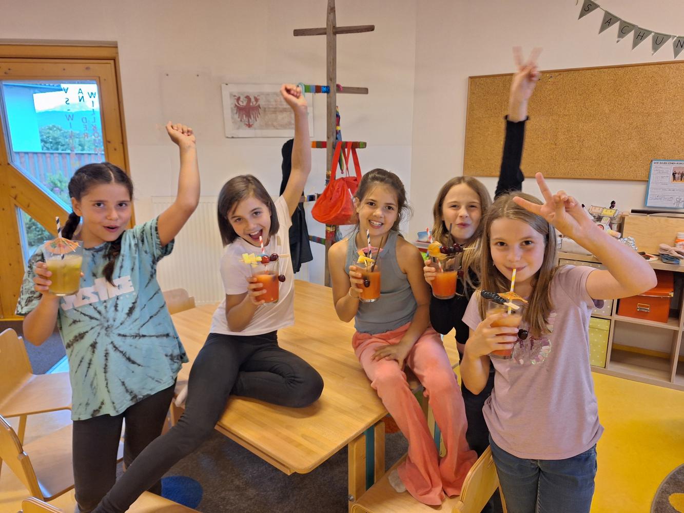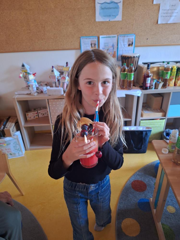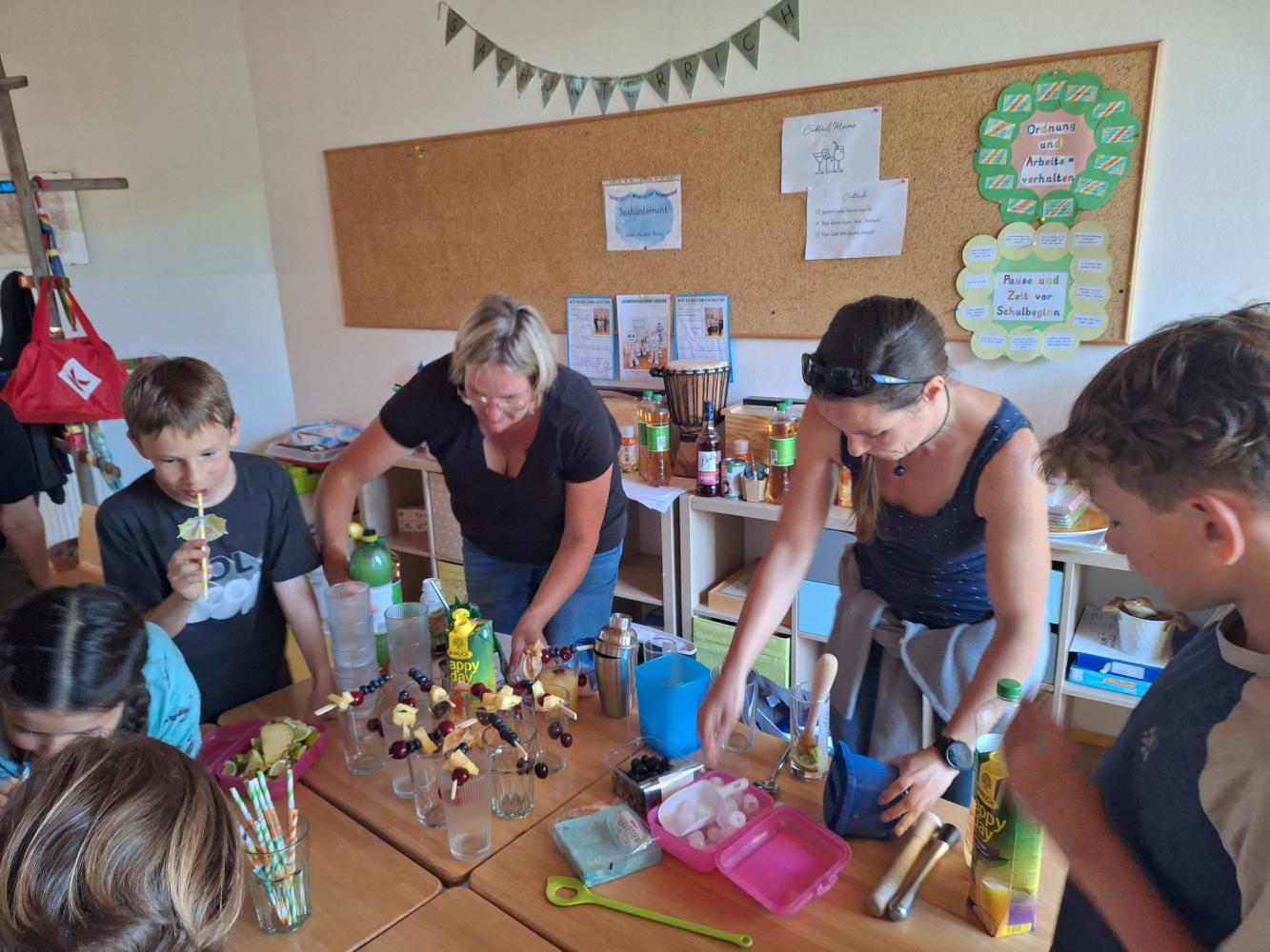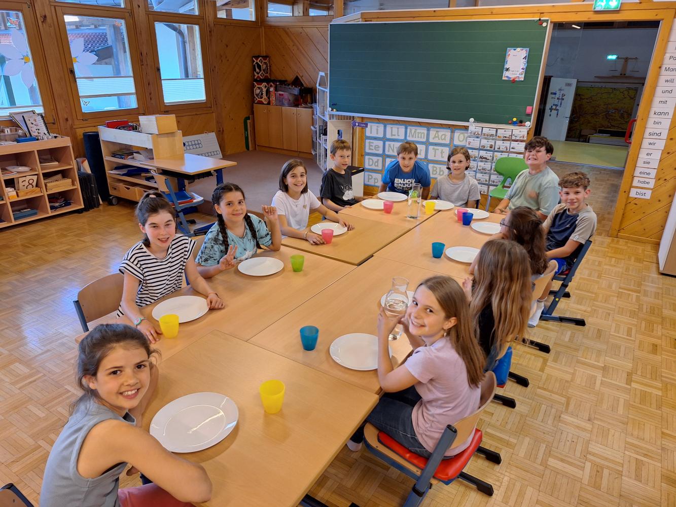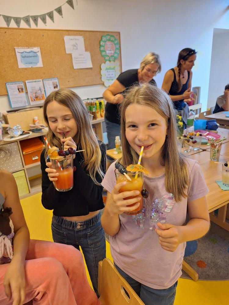 Die 4. Klasse übernachtete zum Abschluss in der Schule. Im Klassenzimmer wurde mit Matten und Schlafsäcken das Nachtlager aufgebaut. Zuerst gestellten wir uns Pizza und im Anschluss begannen wir mit dem Filmschauen. Zur Überraschung der Kinder bereiteten einige Eltern Kinder-Cocktails vor, die die Kinder bei einer kleinen Kinder-Party genossen. Später wurde der Film weiter geschaut und vor dem Schlafengehen erzählten wir uns noch Gruselgeschichten. Am nächsten Tag bereiteten die Kinder ein leckeres Frühstück vor, zu dem auch einige Eltern kamen.