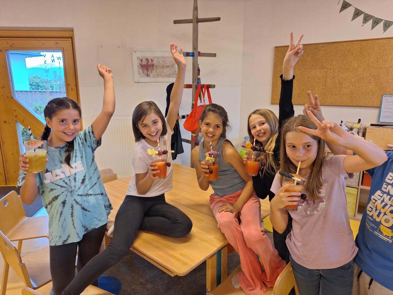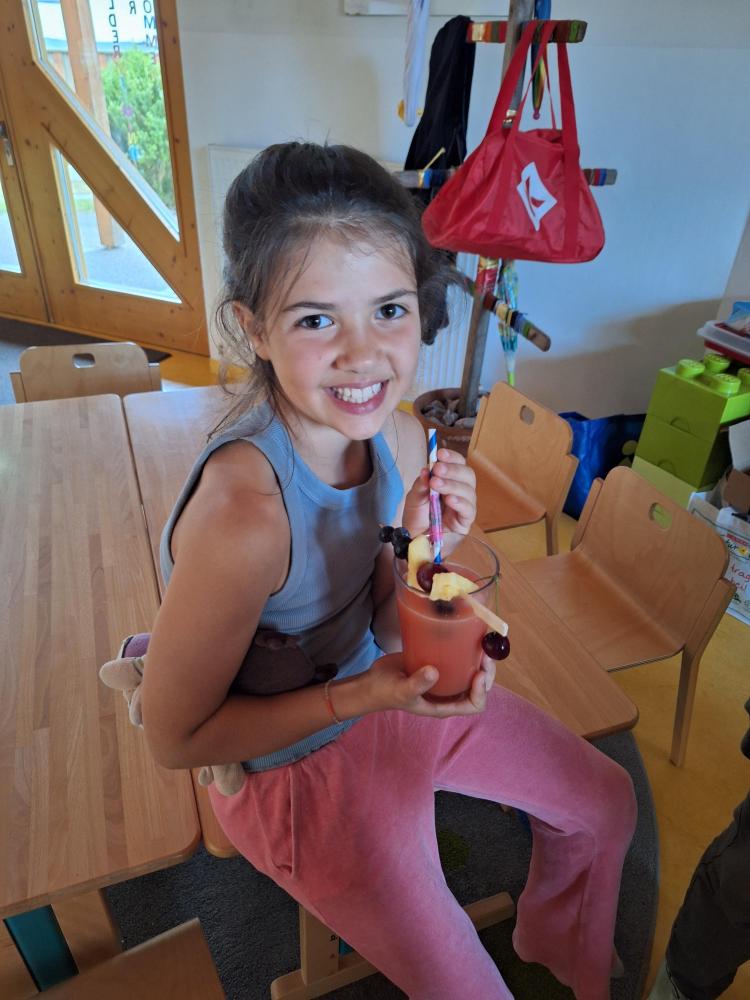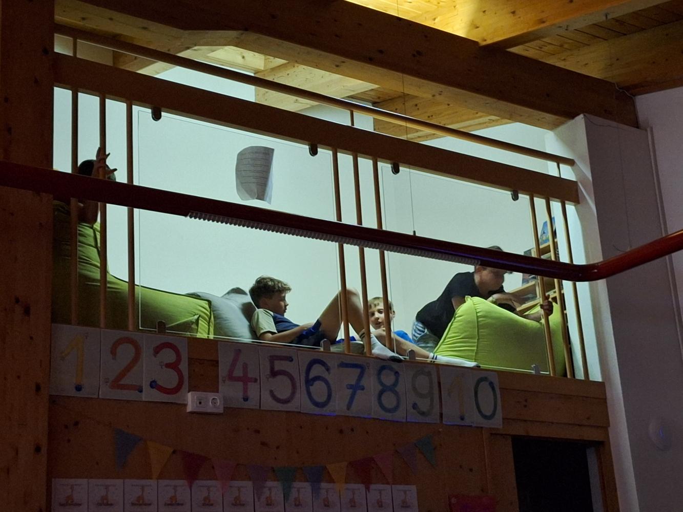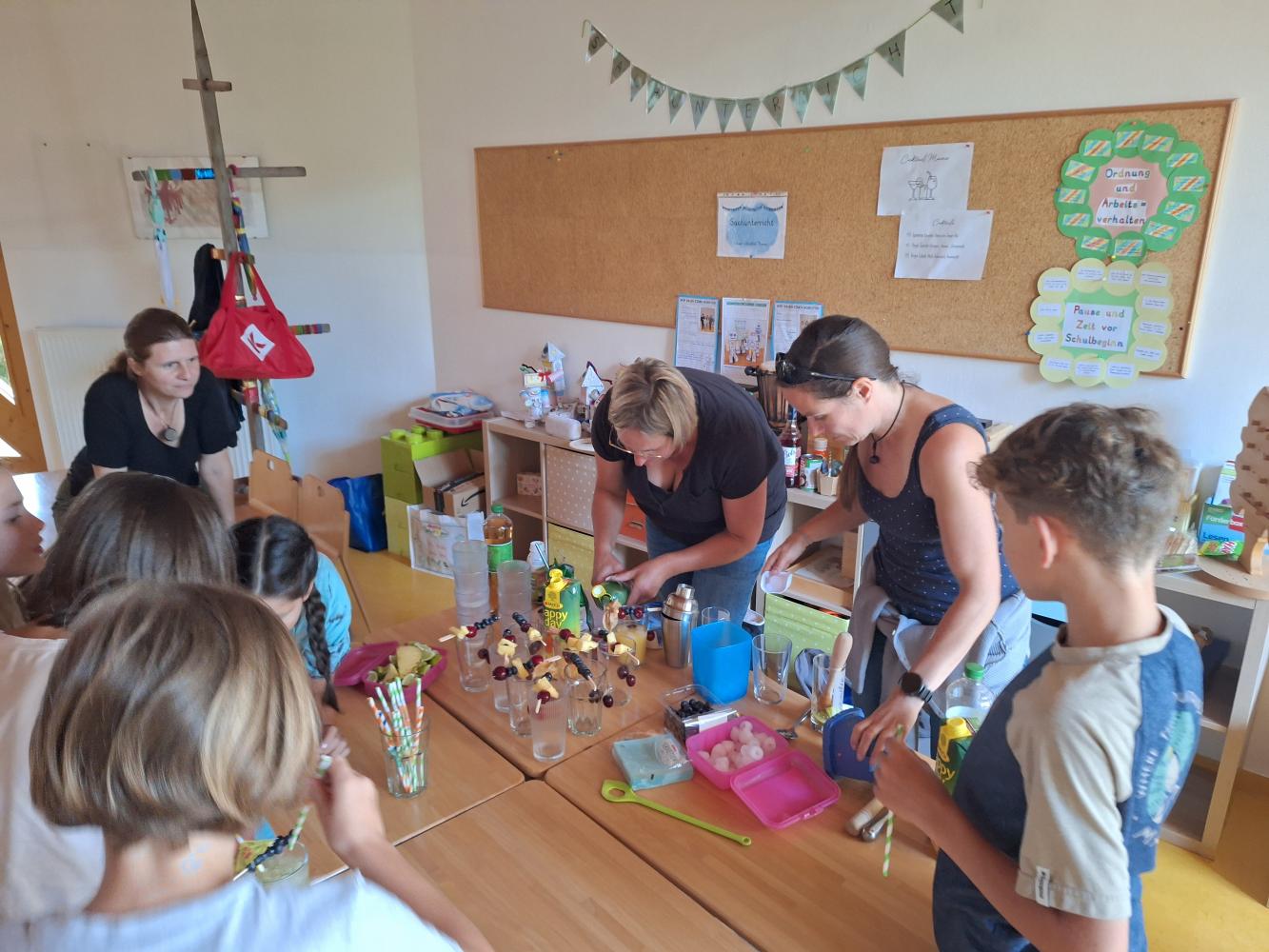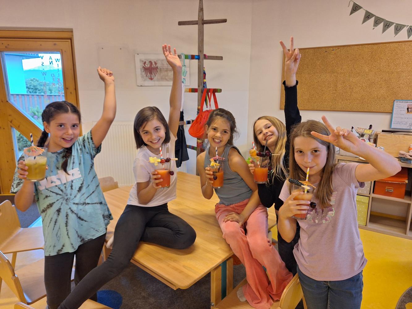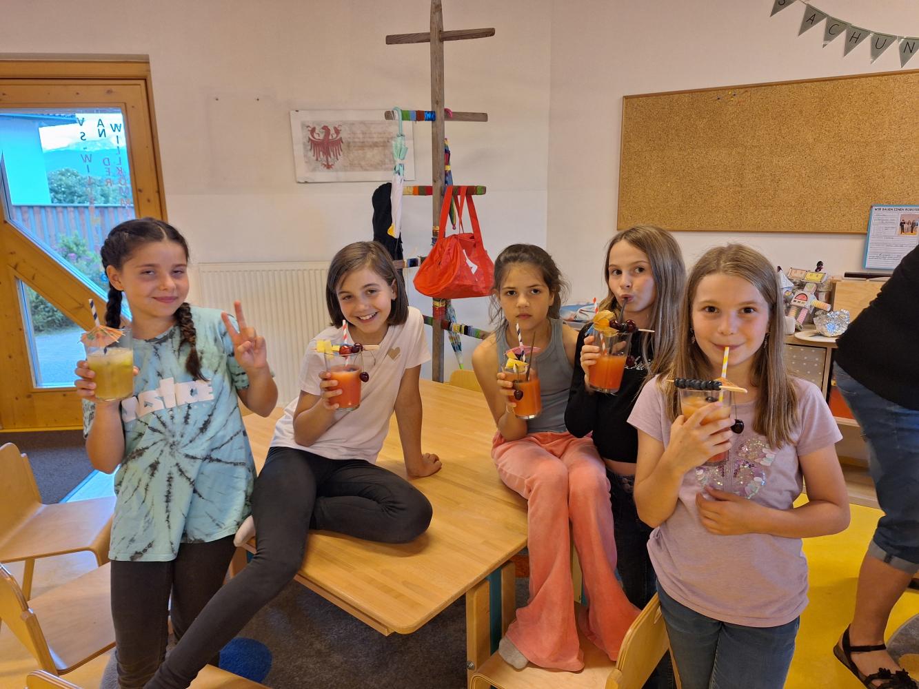 Die 4. Klasse übernachtete zum Abschluss in der Schule. Im Klassenzimmer wurde mit Matten und Schlafsäcken das Nachtlager aufgebaut. Zuerst gestellten wir uns Pizza und im Anschluss begannen wir mit dem Filmschauen. Zur Überraschung der Kinder bereiteten einige Eltern Kinder-Cocktails vor, die die Kinder bei einer kleinen Kinder-Party genossen. Später wurde der Film weiter geschaut und vor dem Schlafengehen erzählten wir uns noch Gruselgeschichten. Am nächsten Tag bereiteten die Kinder ein leckeres Frühstück vor, zu dem auch einige Eltern kamen.